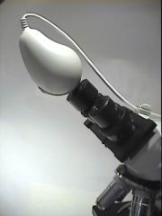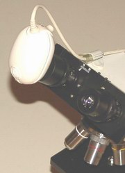 Das Mikroskop verfügt über einen Kamerastutzen mit 30 mm Steckdurchmesser. Bei der Fa. Beyersdörfer wurde ein passender CCD-Kameraadapter mit C-Mount-Gewindeanschluss gekauft. Als CCD-Kamera nutze ich nach einigen Tests mit verschiedenen Typen eine ELMO TSP-481D (ebay, ca. 150,- €). Diese Farbkamera mit 1/3"-CCD-Chip und 12V Spannungsversorgung verfügt über einen Composite- und einen Y/C-Videoausgang (S-VHS-), löst mehr als 470 TV-Linien auf und kommt mit nur 2,2 Lux Mindestbeleuchtungsstärke aus. Das ausgegebene Bild hat 752 x 582 Bildpunkte.